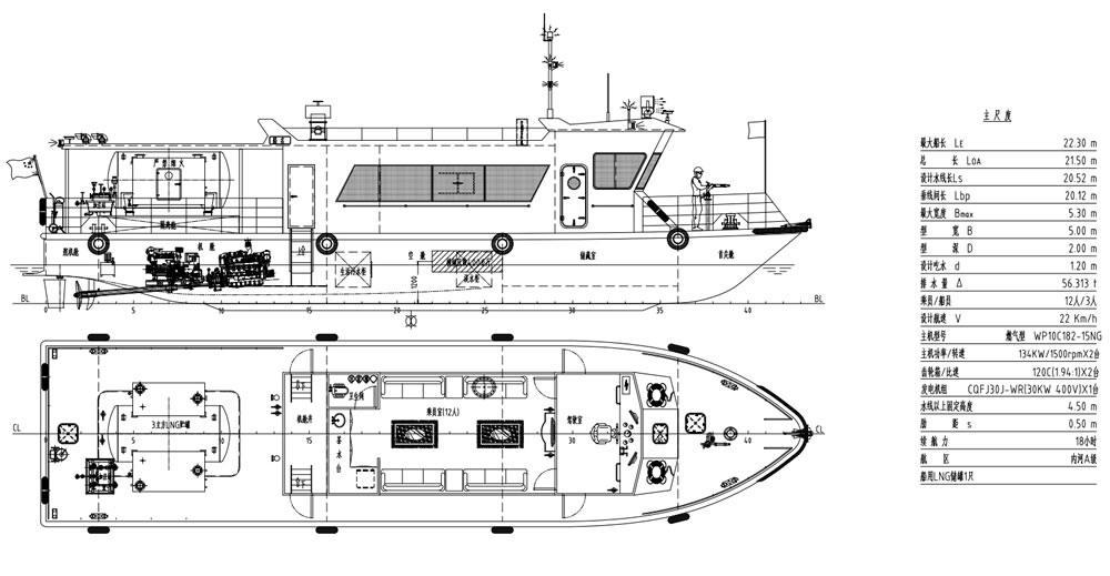 該船舶最大船長22.30 m,設(shè)計(jì)水線長20.40m,最大寬度5.30 m,型深2.00m,設(shè)計(jì)吃水1.10m,排水量48.21t,船員定額3人,乘員定額12人,設(shè)計(jì)航速22公里/小時(shí),zzLNG船用燃料罐1個(gè),燃?xì)饫m(xù)航力約18小時(shí)。
