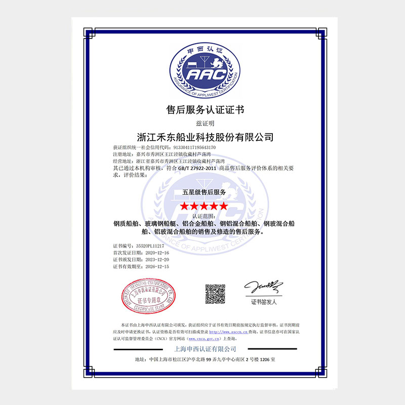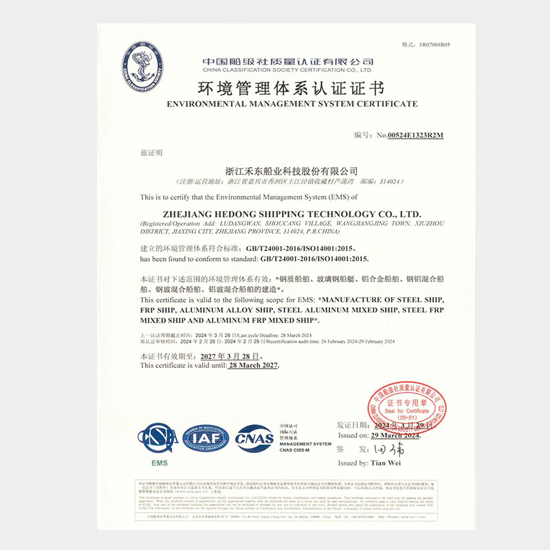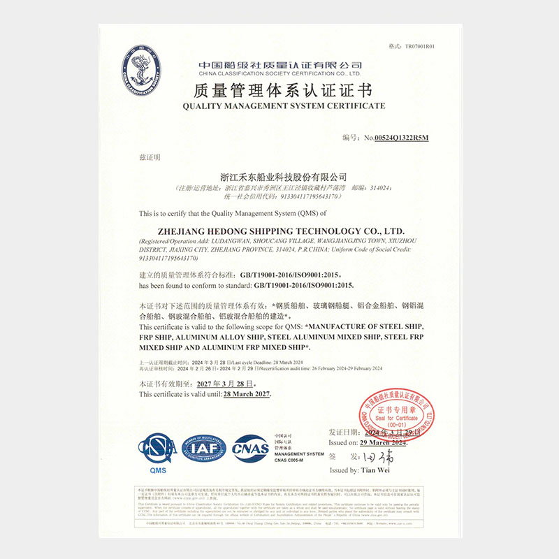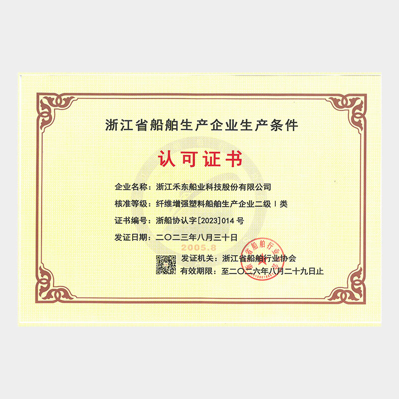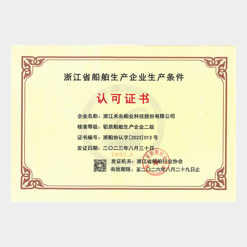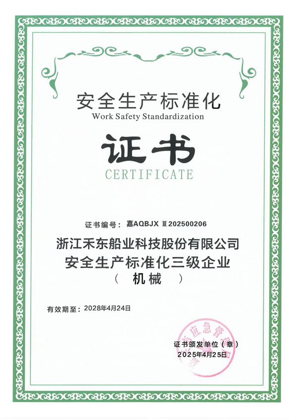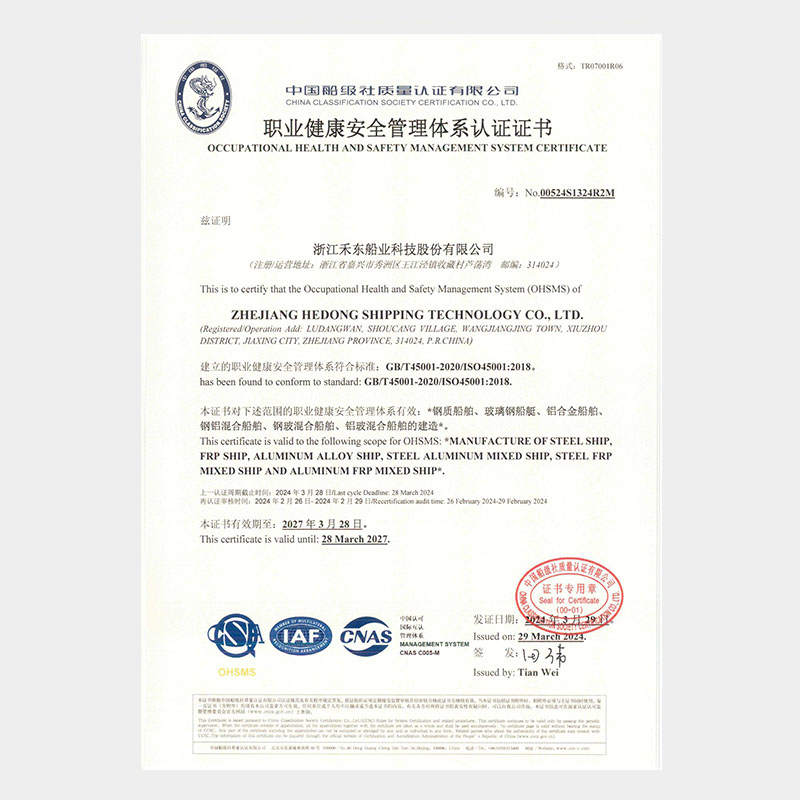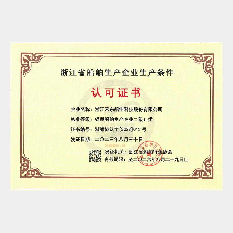 公司具備鋼質船舶制造企業(yè)二級∥類、鋁質船舶制造企業(yè)三級和纖維增強塑料船舶制造企業(yè)二級類資質,擁有中國船級社認證公司認證的IS09001質量管理體系、ISO14001 環(huán)境管理體系認證證書和OHSAS18001職業(yè)健康安全管理體系和按照國家相關標準建立的安全生產標準化三級體系。